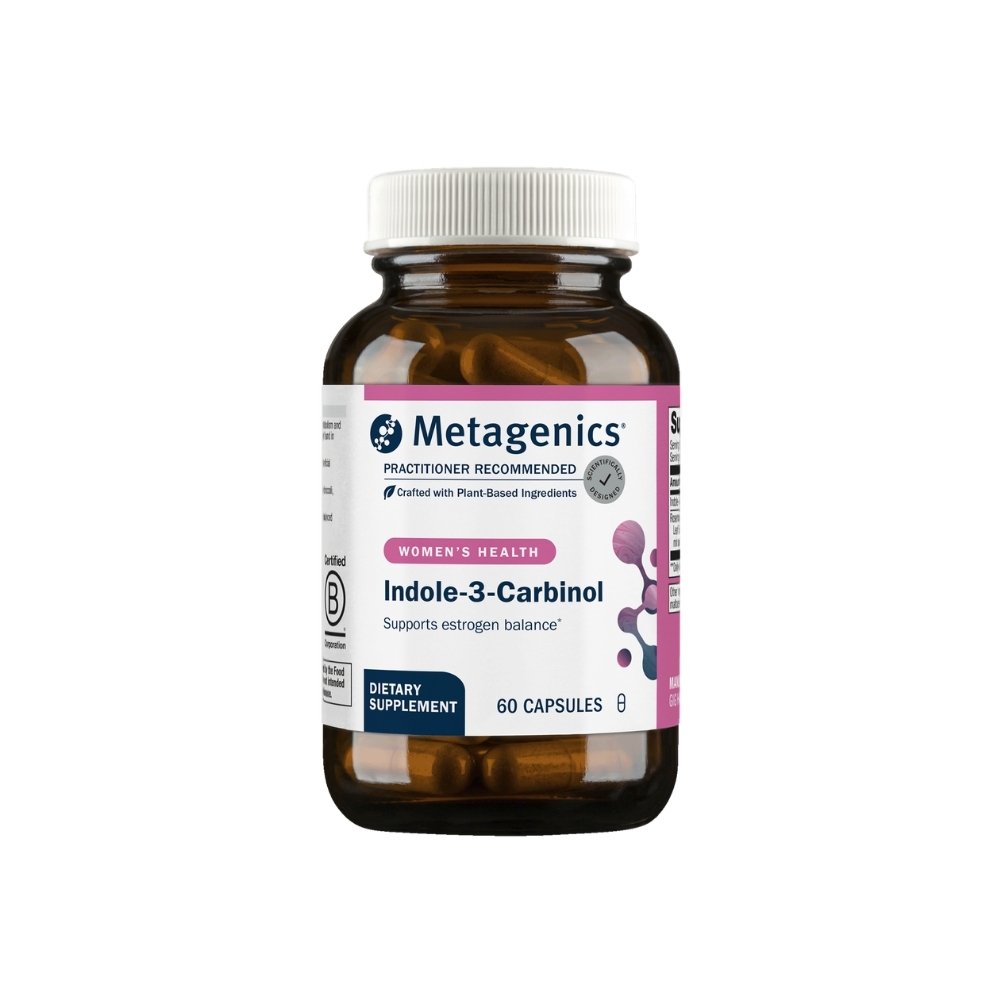 Meta I 3 CTM combines Indole-3-Carbinol (I3C) and 3,3′-Diindolylmethane (DIM) bioactive compounds derived from cruciferous vegetables to support healthy estrogen metabolism and detoxification. I3C and DIM promote the conversion of estrogen into safer, less potent metabolites (2-hydroxyestrone over 16-hydroxyestrone), reducing estrogen-driven cellular proliferation. This formula supports hormonal balance, breast and prostate health, and overall detoxification capacity. Suitable for both men and women. Non-GMO, vegetarian, gluten-free.
